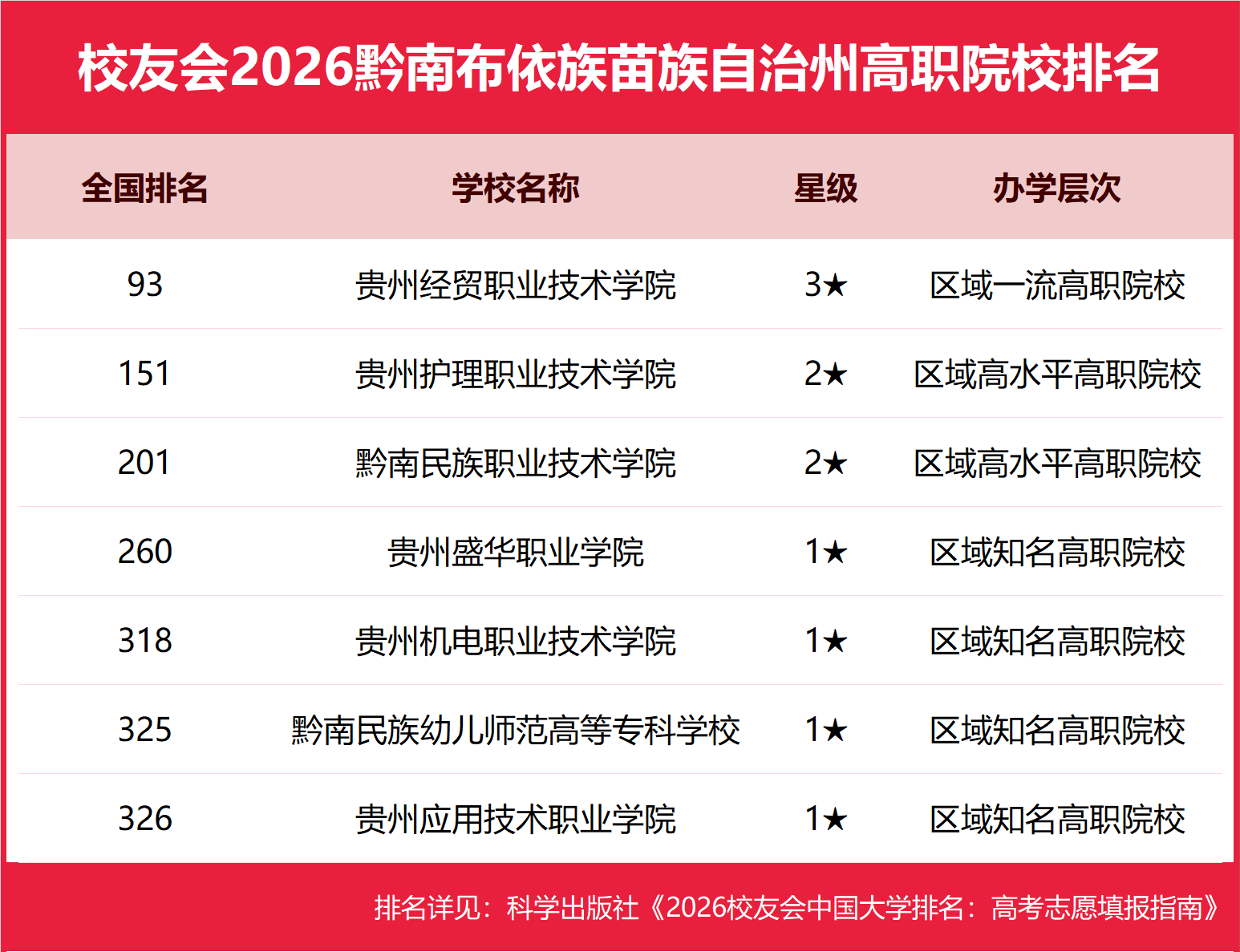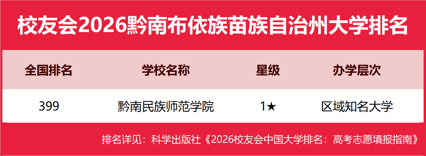 | 校友会2026黔南布依族苗族自治州大学排名,黔南民族师范学院、贵州经贸职业技术学院第一 | |||