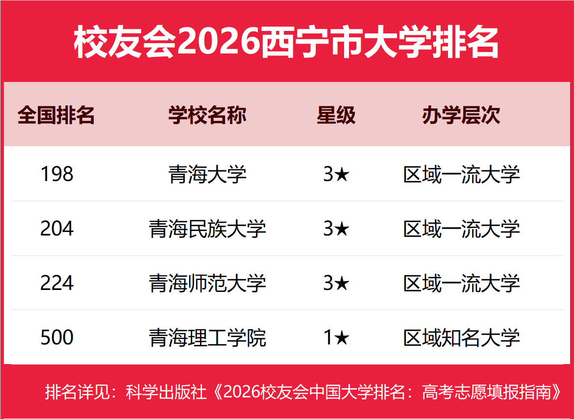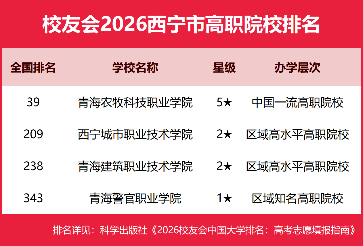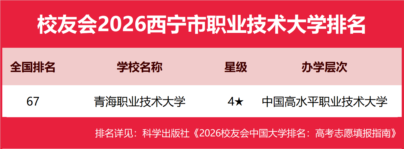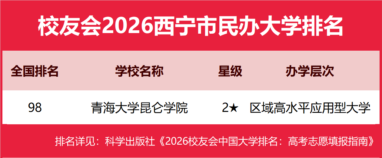 | 校友会2026西宁市大学排名,青海大学、青海大学昆仑学院、青海职业技术大学、青海农牧科技职业学院第一 | |||