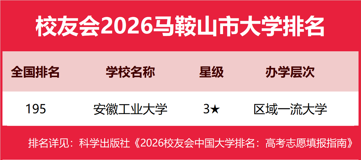 1月12日,全国第三方大学评价机构艾瑞深校友会网(Cuaa.net)正式发布校友会2026中国大学排名、2026马鞍山市大学排名、2026马鞍山市民办大学排名和2026马鞍山市高职院校排名等榜单。 北京大学问鼎校友会2026中国大学排名榜首,连续20年蝉联中国大学排名冠军。清华大学第二,中国科学院大学、浙江大学并列第三,南开大学挺进前七。其中,安徽工业大学、皖江工学院、马鞍山学院、马鞍山师范高等专科学校分列2026马鞍山市大学、民办大学和高职院校排名第一 由艾瑞深研究团队撰写的《2026校友会中国大学排名:高考志愿填报指南》一书将由科学出版社出版发行。 科学出版社《2026校友会中国大学排名:高考志愿填报指南》 校友会2026马鞍山市大学排名,安徽工业大学第一 在校友会2026中国大学排名中,安徽工业大学全国排名第195名,雄居校友会2026马鞍山市大学排名第一。 校友会2026马鞍山市民办大学排名,皖江工学院、马鞍山学院并列第一 在校友会2026中国民办大学排名中,皖江工学院、马鞍山学院全国排名第58名,雄居校友会2026马鞍山市民办大学排名并列第一。 校友会2026马鞍山市高职院校排名,马鞍山师范高等专科学校第一,马鞍山职业技术学院前二 在校友会2026中国高职院校排名中,马鞍山师范高等专科学校全国排名第139名,雄居校友会2026马鞍山市高职院校排名第一。马鞍山职业技术学院第2。 校友会中国大学排名首发于2003年,至今已有24年的历史,已成为具有广泛社会影响力、公信力、参考价值与创新力的中国大学排名领先品牌。 艾瑞深校友会2026中国大学排名评价指标体系由办学层次、思政教育、教学质量、高层次人才、杰出校友、学科专业、科研基地、科研项目、科研成果、社会服务、社会声誉和国际影响力等12大一级指标组成。 |