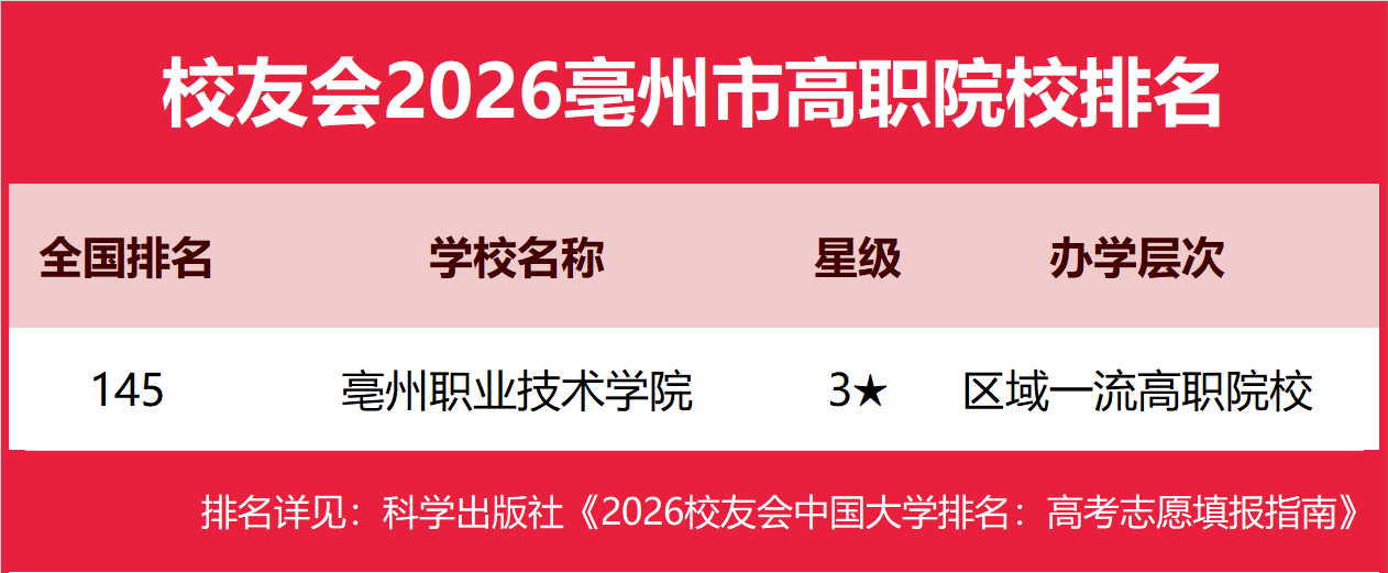 | 校友会2026亳州市大学排名,亳州学院、亳州职业技术学院第一 | |||