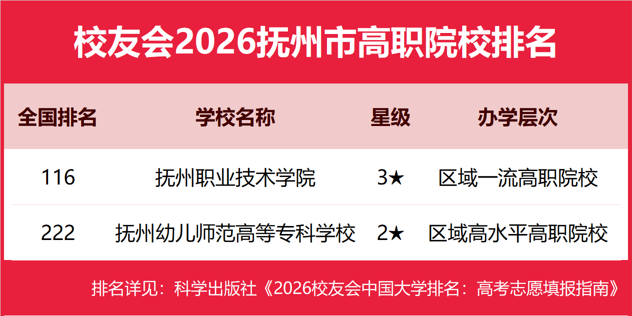 在校友会2026中国高职院校排名中,抚州职业技术学院全国排名第116名,雄居校友会2026抚州市高职院校排名第一。抚州幼儿师范高等专科学校第2。