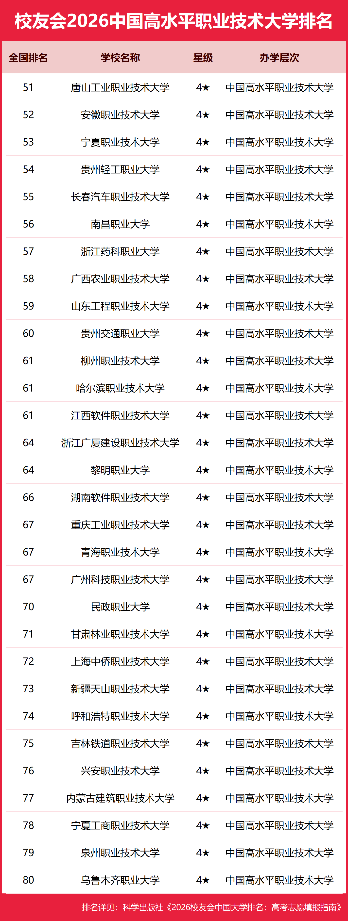为给2026全国高考考生报考中国高水平职业技术大学(4★)提供参考指南,1月12日,全国第三方大学评价机构艾瑞深校友会网(Cuaa.net)撰写完成、科学出版社即将出版的《2026校友会中国大学排名:高考志愿填报指南》发布校友会2026中国高水平职业技术大学排名,唐山工业职业技术大学、安徽职业技术大学、宁夏职业技术大学、贵州轻工职业大学、长春汽车职业技术大学、南昌职业大学等高校荣膺2026中国高水平职业技术大学(4★)美誉,跻身中国高水平职业技术大学行列。 科学出版社《2026校友会中国大学排名:高考志愿填报指南》 北京大学连续20年蝉联中国大学排名首位,雄居2026校友会中国大学排名第一。清华大学居第2,中国科学院大学、浙江大学并列第3,西湖大学、南方科技大学与上海科技大学挺进全国20强;福耀科技大学首次纳入中国大学排名,跻身全国前50强。 西湖大学、武昌首义学院、三亚学院、西安欧亚学院与广州南方学院位列校友会2026年中国民办大学排名首位。西交利物浦大学、宁波诺丁汉大学和香港中文大学(深圳)位列2026年中国合作办学大学排名前三甲。 深圳职业技术大学、海南科技职业大学与河北科技工程职业技术大学雄居校友会2026年中国职业技术大学排名前三甲。江西应用技术职业学院、合肥职业技术学院和浙江金融职业学院位列校友会2026年中国高职院校排名榜首。 校友会中国大学排名首发于2003年,至今已有24年的历史,已成为具有广泛社会影响力、公信力、参考价值、创新力的中国大学排名领先品牌。校友会2026年中国大学排名评价指标体系由办学层次、思政教育、杰出校友、教学质量、高层次人才、学科专业、科研成果、科研基地、科研项目、社会服务、社会声誉、国际影响力等12大一级指标组成。 校友会2026中国大学排名评价指标体系 在校友会2026中国职业技术大学星级排名中,中国四星级职业技术大学(4★)是中国高水平职业技术大学,是中国综合实力较强和办学水平较高的职业技术大学。 唐山工业职业技术大学、安徽职业技术大学、宁夏职业技术大学位居2026中国高水平职业技术大学排名前三甲 在校友会2026中国职业技术大学排名中,唐山工业职业技术大学最具竞争力,位居全国第51名,位居校友会2026中国高水平职业技术大学排名首位。安徽职业技术大学第二。宁夏职业技术大学第三。位居前10强的其他高校为贵州轻工职业大学、长春汽车职业技术大学、南昌职业大学、浙江药科职业大学、广西农业职业技术大学、山东工程职业技术大学、贵州交通职业大学。 位居2026中国高水平职业技术大学排名前20强的其他高校为柳州职业技术大学、哈尔滨职业技术大学、江西软件职业技术大学、浙江广厦建设职业技术大学、黎明职业大学、湖南软件职业技术大学、重庆工业职业技术大学、青海职业技术大学、广州科技职业技术大学、民政职业大学。 |
