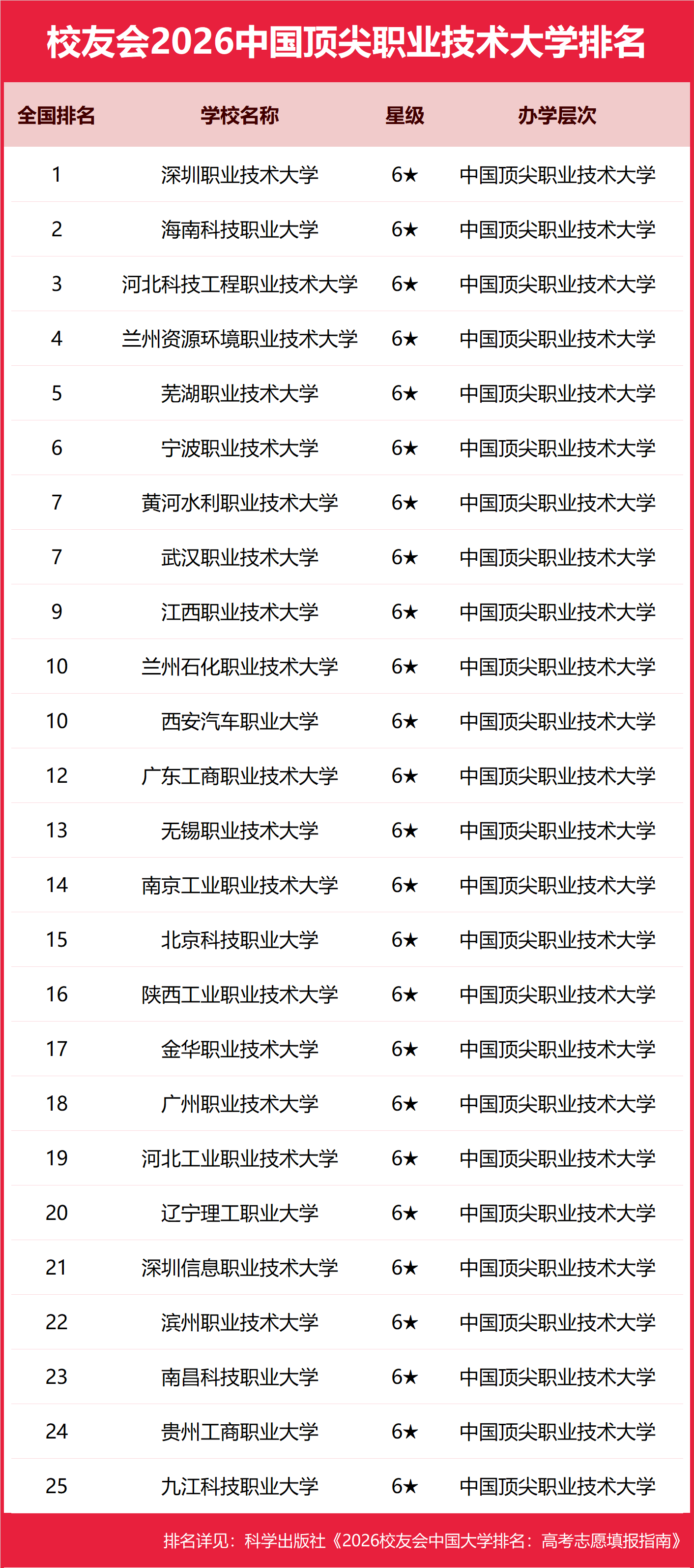 为给2026全国高考考生报考中国顶尖职业技术大学(6★)提供参考指南,1月12日,全国第三方大学评价机构艾瑞深校友会网(Cuaa.net)撰写完成、科学出版社即将出版的《2026校友会中国大学排名:高考志愿填报指南》发布校友会2026中国顶尖职业技术大学排名,深圳职业技术大学、海南科技职业大学、河北科技工程职业技术大学、兰州资源环境职业技术大学、芜湖职业技术大学等高校荣膺2026中国顶尖职业技术大学(6★)美誉,跻身中国顶尖职业技术大学行列。 科学出版社《2026校友会中国大学排名:高考志愿填报指南》 北京大学连续20年蝉联中国大学排名首位,雄居校友会2026年中国大学排名第一。清华大学列第2,中国科学院大学、浙江大学并列第3,西湖大学、南方科技大学、上海科技大学挺进全国20强;福耀科技大学首次纳入中国大学排名,跻身全国50强。 西湖大学、武昌首义学院、三亚学院、西安欧亚学院与广州南方学院位列校友会2026年中国民办大学排名首位。西交利物浦大学、宁波诺丁汉大学和香港中文大学(深圳)位列2026年中国合作办学大学排名前三甲。 深圳职业技术大学、海南科技职业大学与河北科技工程职业技术大学雄居校友会2026年中国职业技术大学排名前三甲。江西应用技术职业学院、合肥职业技术学院和浙江金融职业学院位列校友会2026年中国高职院校排名榜首。 校友会中国大学排名首发于2003年,至今已有24年的历史,已成为具有广泛社会影响力、公信力、参考价值、创新力的中国大学排名领先品牌。校友会2026年中国大学排名评价指标体系由办学层次、思政教育、杰出校友、教学质量、高层次人才、学科专业、科研成果、科研基地、科研项目、社会服务、社会声誉、国际影响力等12大一级指标组成。 校友会2026中国大学排名评价指标体系 在校友会2026中国职业技术大学星级排名中,中国六星级职业技术大学(6★)是中国顶尖职业技术大学,是中国综合实力最强、办学水平最高的职业技术大学。 深圳职业技术大学位居2026中国顶尖职业技术大学排名第一,海南科技职业大学、河北科技工程职业技术大学前三 在最新校友会2026中国职业技术大学排名中,深圳职业技术大学办学实力最强、最具竞争力,位居全国第1名,问鼎2026中国顶尖职业技术大学排名冠军。海南科技职业大学、河北科技工程职业技术大学分列第二第三,名列前前10强的其他高校为兰州资源环境职业技术大学、芜湖职业技术大学、宁波职业技术大学、黄河水利职业技术大学、武汉职业技术大学、江西职业技术大学、兰州石化职业技术大学、西安汽车职业大学。 位居校友会2026中国顶尖职业技术大学排名前20的其他职业技术大学为广东工商职业技术大学、无锡职业技术大学、南京工业职业技术大学、北京科技职业大学、陕西工业职业技术大学、金华职业技术大学、广州职业技术大学、河北工业职业技术大学和辽宁理工职业大学等高校。 |