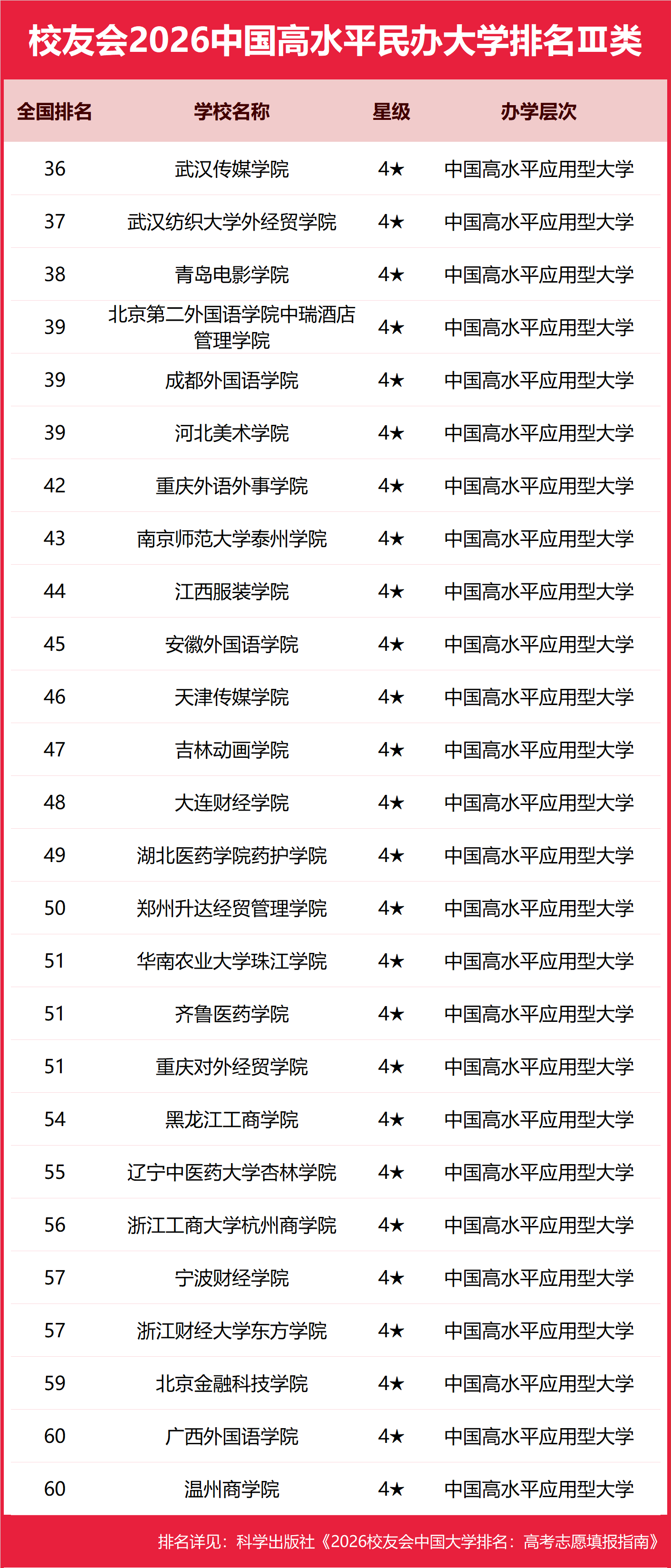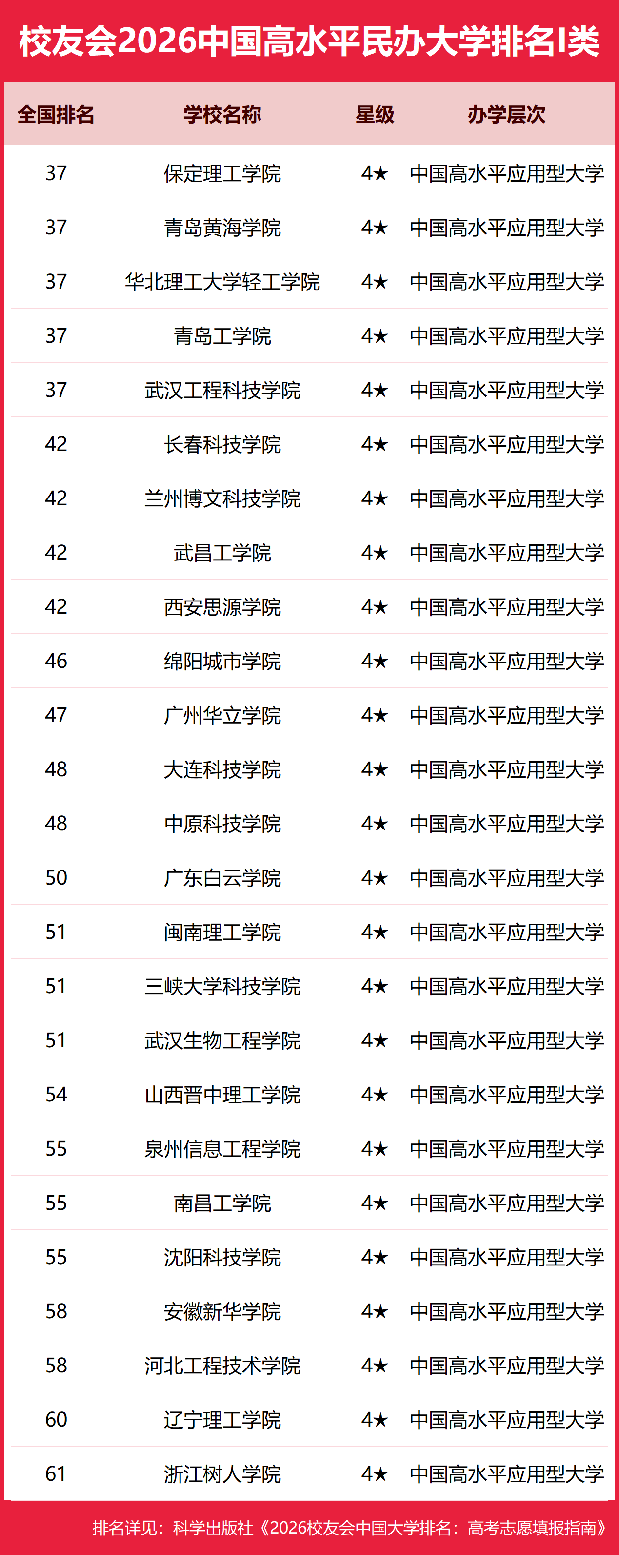 为给2026全国高考考生报考中国高水平民办大学(4★)提供参考指南,1月12日,全国第三方大学评价机构艾瑞深校友会网(Cuaa.net)撰写完成、科学出版社即将出版的《2026校友会中国大学排名:高考志愿填报指南》发布校友会2026中国高水平民办大学排名,保定理工学院、华北理工大学轻工学院、长春科技学院、重庆城市科技学院、贵州黔南科技学院、山东英才学院、武汉传媒学院、青岛电影学院等高校荣膺2026中国高水平民办大学(4★)美誉,跻身中国高水平民办大学行列。 科学出版社《2026校友会中国大学排名:高考志愿填报指南》 北京大学连续20年蝉联中国大学排名首位,雄居校友会2026年中国大学排名榜首。清华大学第2,中国科学院大学、浙江大学并列第3,西湖大学、南方科技大学、上海科技大学挺进全国20强;福耀科技大学首次纳入校友会中国大学排名,跻身全国50强。 西湖大学、武昌首义学院、三亚学院、西安欧亚学院与广州南方学院位列校友会2026年中国民办大学排名首位。西交利物浦大学、宁波诺丁汉大学和香港中文大学(深圳)位列2026年中国合作办学大学排名前三甲。 江西应用技术职业学院、合肥职业技术学院和浙江金融职业学院位列校友会2026年中国高职院校排名榜首。深圳职业技术大学、海南科技职业大学与河北科技工程职业技术大学雄居校友会2026年中国职业技术大学排名前三甲。 校友会中国大学排名首发于2003年,至今已有24年的历史,已成为具有广泛社会影响力、公信力、参考价值、创新力的中国大学排名领先品牌。校友会2026年中国大学排名评价指标体系由办学层次、思政教育、杰出校友、教学质量、高层次人才、学科专业、科研成果、科研基地、科研项目、社会服务、社会声誉、国际影响力等12大一级指标组成。 校友会2026中国大学排名评价指标体系 在校友会2026中国大学星级排名中,中国四星级民办大学(4★)是中国高水平应用型大学,中国四星级民办大学是中国综合实力较强、办学水平较高的民办高校。 按照2026中国大学分类标准,民办大学与独立学院被归类为中国应用型大学,依据参评民办大学优势学科专业所属门类,分为I类、Ⅱ类与Ⅲ类等3个类型进行评价。其中Ⅰ类民办大学为以工学门类学科专业为优势的大学,Ⅱ类民办大学为以理学及人文社科门类学科专业为优势的大学,Ⅲ类民办大学为以艺术、体育、经济、管理、农学、教育学和医学等门类学科专业为优势的大学。 保定理工学院、重庆城市科技学院、武汉传媒学院雄居2026中国高水平民办大学排名第一 在校友会2026中国民办大学排名I类中,保定理工学院、青岛黄海学院、华北理工大学轻工学院、青岛工学院、武汉工程科技学院综合实力最强,雄居校友会2026中国高水平民办大学排名I类第一,荣膺2026中国高水平民办大学(4★)美誉,跻身中国高水平民办大学行列。长春科技学院、兰州博文科技学院、武昌工学院、西安思源学院、绵阳城市学院、广州华立学院、大连科技学院、中原科技学院、广东白云学院、闽南理工学院、三峡大学科技学院、武汉生物工程学院、山西晋中理工学院、泉州信息工程学院、南昌工学院位列校友会2026中国高水平民办大学排名I类前20强。 在校友会2026中国民办大学排名Ⅱ类中,重庆城市科技学院综合实力最强,雄居校友会2026中国高水平民办大学排名Ⅱ类第一,荣膺2026中国高水平民办大学(4★)美誉,跻身中国高水平民办大学行列。贵州黔南科技学院第2,天津天狮学院第3,山东英才学院、电子科技大学中山学院、三江学院、滇池学院、丽江文化旅游学院、湖南涉外经济学院、浙江师范大学行知学院、武汉学院、武汉设计工程学院、西安交通大学城市学院、仰恩大学、西南交通大学希望学院、北京科技大学天津学院、长春人文学院、长江大学文理学院、北京工业大学耿丹学院、广州新华学院、无锡太湖学院、成都文理学院、潍坊理工学院位列校友会2026中国高水平民办大学排名Ⅱ类前20强。 在校友会2026中国民办大学排名Ⅲ类中,武汉传媒学院综合实力最强,雄居校友会2026中国高水平民办大学排名Ⅲ类第一,荣膺2026中国高水平民办大学(4★)美誉,跻身中国高水平民办大学行列。武汉纺织大学外经贸学院第2,青岛电影学院第3,北京第二外国语学院中瑞酒店管理学院、成都外国语学院、河北美术学院、重庆外语外事学院、南京师范大学泰州学院、江西服装学院、安徽外国语学院、天津传媒学院、吉林动画学院、大连财经学院、湖北医药学院药护学院、郑州升达经贸管理学院、华南农业大学珠江学院、齐鲁医药学院、重庆对外经贸学院、黑龙江工商学院、辽宁中医药大学杏林学院位列校友会2026中国高水平民办大学排名Ⅲ类前20强。 |