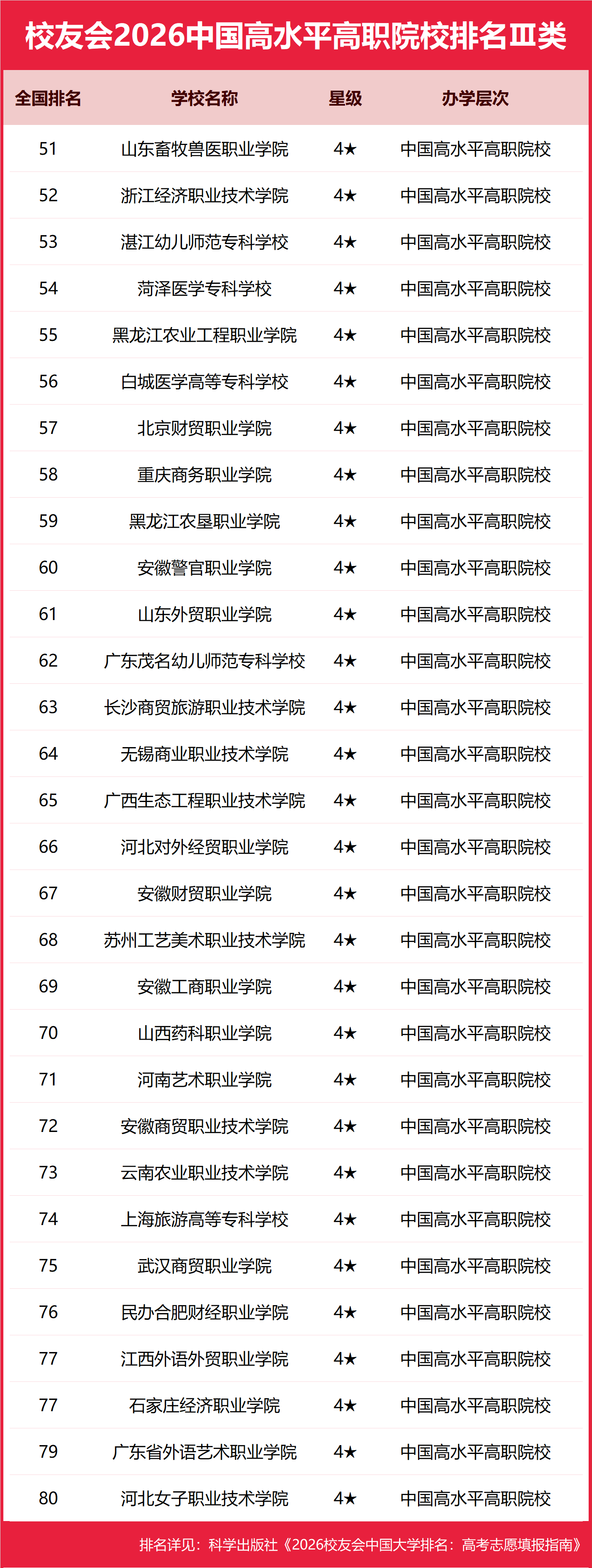 为给2026全国高考考生报考中国高水平高职院校(4★)提供参考指南,1月12日,全国第三方大学评价机构艾瑞深校友会网(Cuaa.net)撰写完成、科学出版社即将出版的《2026校友会中国大学排名:高考志愿填报指南》发布校友会2026中国高水平高职院校排名,喀什职业技术学院、青岛职业技术学院、山东畜牧兽医职业学院、石家庄科技信息职业学院、濮阳职业技术学院、广东农工商职业技术学院、延安职业技术学院、浙江经济职业技术学院、湛江幼儿师范专科学校等高校荣膺2026中国高水平高职院校(4★)美誉,跻身中国高水平高职院校行列。 科学出版社《2026校友会中国大学排名:高考志愿填报指南》 北京大学连续20年蝉联中国大学排名首位,雄居校友会2026年中国大学排名第一。清华大学列第2,中国科学院大学、浙江大学并列第3,西湖大学、南方科技大学、上海科技大学挺进全国20强;福耀科技大学首次纳入中国大学排名,跻身全国50强。 西湖大学、武昌首义学院、三亚学院、西安欧亚学院与广州南方学院位列校友会2026年中国民办大学排名首位。西交利物浦大学、宁波诺丁汉大学和香港中文大学(深圳)位列2026年中国合作办学大学排名前三甲。 深圳职业技术大学、海南科技职业大学与河北科技工程职业技术大学雄居校友会2026年中国职业技术大学排名前三甲。江西应用技术职业学院、合肥职业技术学院和浙江金融职业学院位列校友会2026年中国高职院校排名榜首。 校友会中国大学排名首发于2003年,至今已有24年的历史,已成为具有广泛社会影响力、公信力、参考价值、创新力的中国大学排名领先品牌。校友会2026年中国大学排名评价指标体系由办学层次、思政教育、杰出校友、教学质量、高层次人才、学科专业、科研成果、科研基地、科研项目、社会服务、社会声誉、国际影响力等12大一级指标组成。 校友会2026中国大学排名评价指标体系 在校友会2026中国高职院校星级排名中,中国四星级高职院校(4★)是中国高水平高职院校,中国四星级高职院校是中国综合实力较强、办学水平较高的高职院校。 喀什职业技术学院、青岛职业技术学院、山东畜牧兽医职业学院雄居2026中国高水平高职院校排名第一 在校友会2026中国高职院校排名I类中,喀什职业技术学院综合实力最强,雄居校友会2026中国高水平高职院校排名I类榜首,荣膺2026中国四星级高职院校(4★)美誉,跻身中国高水平高职院校行列。石家庄科技信息职业学院、濮阳职业技术学院、鄂州职业大学、烟台汽车工程职业学院、绍兴职业技术学院、湖南工业职业技术学院、上海电子信息职业技术学院、云南工程职业学院、潍坊工程职业学院位列校友会2026中国高水平高职院校排名I类前10强。 在校友会2026中国高职院校排名Ⅱ类中,青岛职业技术学院综合实力最强,雄居校友会2026中国高水平高职院校排名Ⅱ类榜首,荣膺2026中国四星级高职院校(4★)美誉,跻身中国高水平高职院校行列。广东农工商职业技术学院、延安职业技术学院、石家庄职业技术学院、江门职业技术学院、东营职业学院、巴音郭楞职业技术学院、洛阳职业技术学院、贵州城市职业学院、沧州职业技术学院位列校友会2026中国高水平高职院校排名Ⅱ类前10强。 在校友会2026中国高职院校排名Ⅲ类中,山东畜牧兽医职业学院综合实力最强,雄居校友会2026中国高水平高职院校排名Ⅲ类榜首,荣膺2026中国四星级高职院校(4★)美誉,跻身中国高水平高职院校行列。浙江经济职业技术学院、湛江幼儿师范专科学校、菏泽医学专科学校、黑龙江农业工程职业学院、白城医学高等专科学校、北京财贸职业学院、重庆商务职业学院、黑龙江农垦职业学院、安徽警官职业学院位列校友会2026中国高水平高职院校排名Ⅲ类前10强。 |