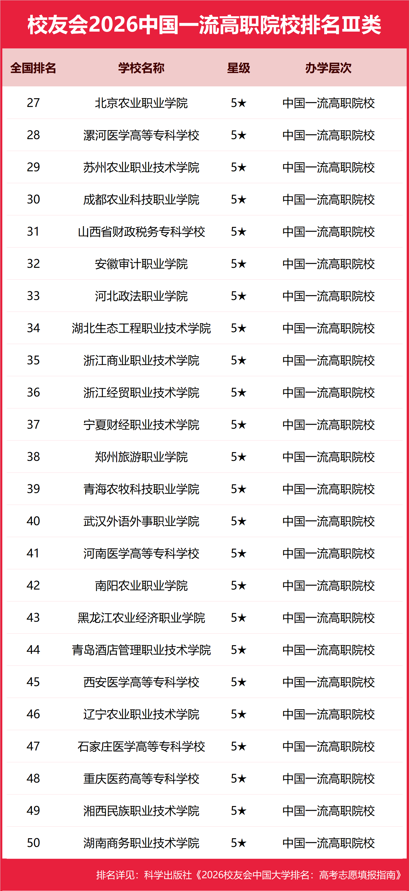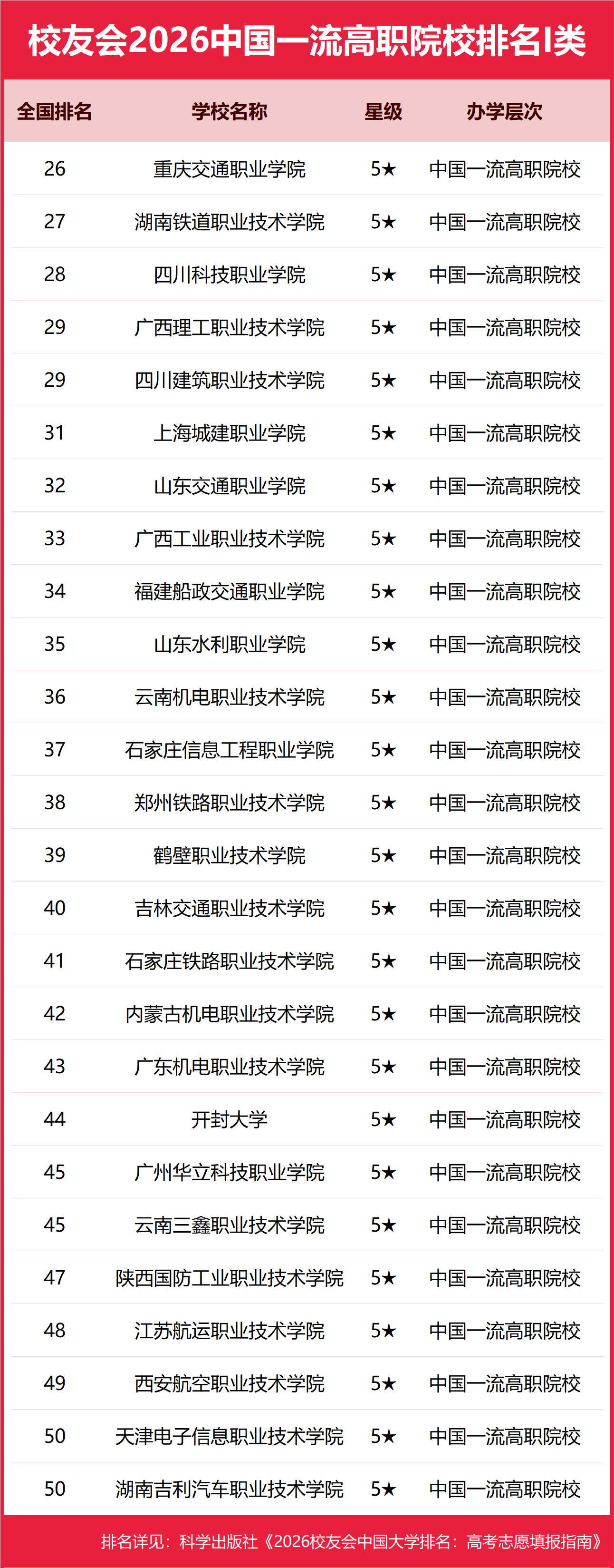 为给2026全国高考考生报考中国一流高职院校(5★)提供参考指南,1月12日,全国第三方大学评价机构艾瑞深校友会网(Cuaa.net)撰写完成、科学出版社即将出版的《2026校友会中国大学排名:高考志愿填报指南》发布校友会2026中国一流高职院校排名,重庆交通职业学院、浙江工业职业技术学院、北京农业职业学院、湖南铁道职业技术学院、四川科技职业学院、郑州城市职业学院、广西英华国际职业学院、漯河医学高等专科学校、苏州农业职业技术学院等高校荣膺2026中国一流高职院校(5★)美誉,跻身中国一流高职院校行列。 科学出版社《2026校友会中国大学排名:高考志愿填报指南》 北京大学连续20年蝉联中国大学排名首位,雄居校友会2026年中国大学排名第一。清华大学列第2,中国科学院大学、浙江大学并列第3,西湖大学、南方科技大学、上海科技大学挺进全国20强;福耀科技大学首次纳入中国大学排名,跻身全国50强。 西湖大学、武昌首义学院、三亚学院、西安欧亚学院与广州南方学院位列校友会2026年中国民办大学排名首位。西交利物浦大学、宁波诺丁汉大学和香港中文大学(深圳)位列2026年中国合作办学大学排名前三甲。 深圳职业技术大学、海南科技职业大学与河北科技工程职业技术大学雄居校友会2026年中国职业技术大学排名前三甲。江西应用技术职业学院、合肥职业技术学院和浙江金融职业学院位列校友会2026年中国高职院校排名榜首。 校友会中国大学排名首发于2003年,至今已有24年的历史,已成为具有广泛社会影响力、公信力、参考价值、创新力的中国大学排名领先品牌。校友会2026年中国大学排名评价指标体系由办学层次、思政教育、杰出校友、教学质量、高层次人才、学科专业、科研成果、科研基地、科研项目、社会服务、社会声誉、国际影响力等12大一级指标组成。 校友会2026中国大学排名评价指标体系 在校友会2026中国高职院校星级排名中,中国五星级高职院校(5★)是中国一流高职院校,中国五星级高职院校是中国综合实力较强、办学水平一流的高职院校。 重庆交通职业学院、浙江工业职业技术学院、北京农业职业学院雄居2026中国一流高职院校排名第一 在校友会2026中国高职院校排名I类中,重庆交通职业学院综合实力最强,雄居校友会2026中国一流高职院校排名I类榜首,荣膺2026中国五星级高职院校(5★)美誉,跻身中国一流高职院校行列。湖南铁道职业技术学院、四川科技职业学院、广西理工职业技术学院、四川建筑职业技术学院、上海城建职业学院、山东交通职业学院、广西工业职业技术学院、福建船政交通职业学院、山东水利职业学院位列校友会2026中国一流高职院校排名I类前10强。 在校友会2026中国高职院校排名Ⅱ类中,浙江工业职业技术学院综合实力最强,雄居校友会2026中国一流高职院校排名Ⅱ类榜首,荣膺2026中国五星级高职院校(5★)美誉,跻身中国一流高职院校行列。郑州城市职业学院、广西英华国际职业学院、北海职业学院、黑龙江职业学院、新疆石河子职业技术学院、岳阳职业技术学院、德州职业技术学院、福州职业技术学院、南通职业大学、嘉兴职业技术学院位列校友会2026中国一流高职院校排名Ⅱ类前10强。 在校友会2026中国高职院校排名Ⅲ类中,北京农业职业学院综合实力最强,雄居校友会2026中国一流高职院校排名Ⅲ类榜首,荣膺2026中国五星级高职院校(5★)美誉,跻身中国一流高职院校行列。漯河医学高等专科学校、苏州农业职业技术学院、成都农业科技职业学院、山西省财政税务专科学校、安徽审计职业学院、河北政法职业学院、湖北生态工程职业技术学院、浙江商业职业技术学院、浙江经贸职业技术学院位列校友会2026中国一流高职院校排名Ⅲ类前10强。 |