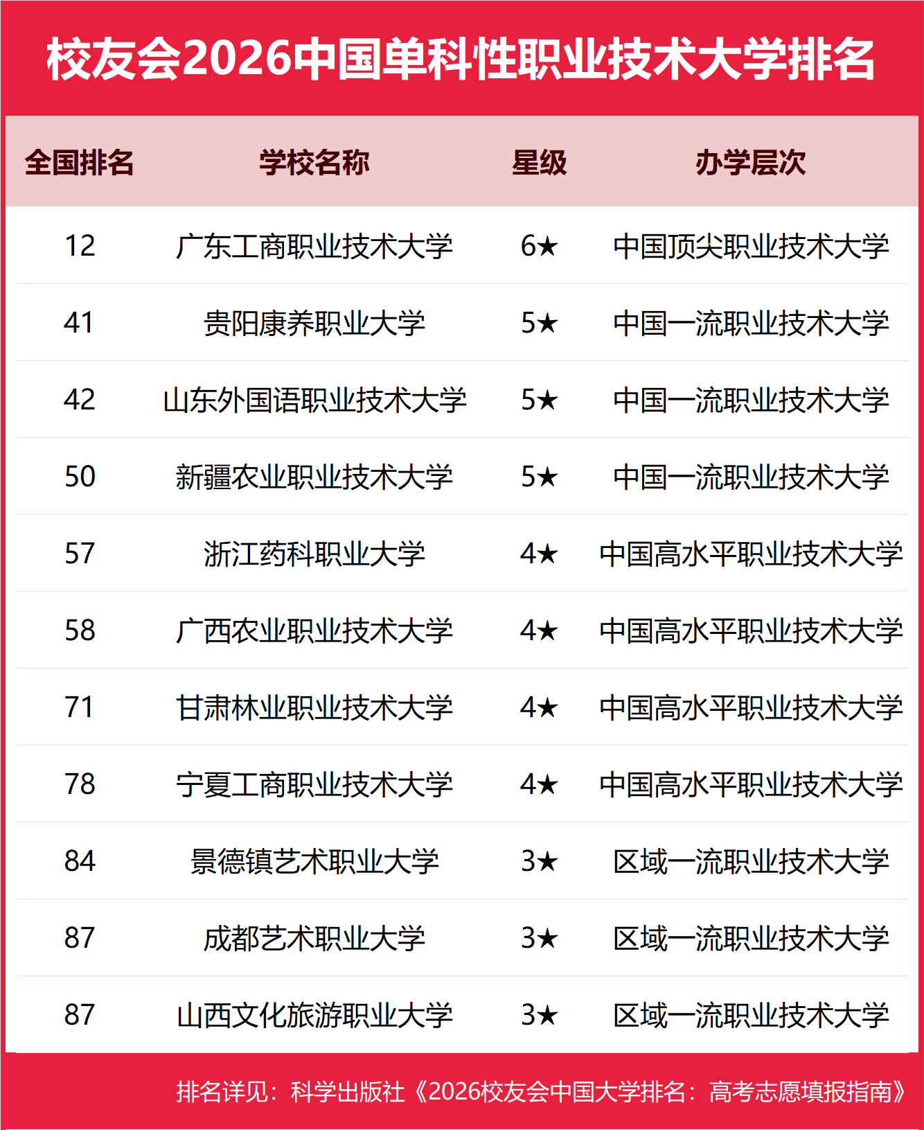 为给2026年全国高考考生报考中国单科性职业技术大学提供参考指南,1月12日,全国第三方大学评价机构艾瑞深校友会网(Cuaa.net)撰写完成、科学出版社即将出版的《2026校友会中国大学排名:高考志愿填报指南》发布校友会2026中国单科性职业技术大学排名,广东工商职业技术大学、贵阳康养职业大学、山东外国语职业技术大学问鼎2026中国单科性职业技术大学排名前三甲。 科学出版社《2026校友会中国大学排名:高考志愿填报指南》 北京大学连续20年蝉联校友会中国大学排名冠军,问鼎校友会2026中国大学排名第一。清华大学第3,中国科学院大学、浙江大学列第3,西湖大学、南方科技大学、上海科技大学挺进全国20强,福耀科技大学首次纳入校友会中国大学排名,跻身全国前50强。 西湖大学、武昌首义学院、三亚学院、西安欧亚学院、广州南方学院位列2026中国民办大学排名首位。西交利物浦大学、宁波诺丁汉大学、香港中文大学(深圳)位列校友会2026中国合作办学大学排名前三甲。 江西应用技术职业学院、合肥职业技术学院、浙江金融职业学院位列校友会2026中国高职院校排名榜首。深圳职业技术大学、海南科技职业大学、河北科技工程职业技术大学雄居2026中国职业技术大学排名前三甲。 校友会中国大学排名首发于2003年,至今已有24年的历史,已成为具有广泛社会影响力、公信力、参考价值、创新力的中国大学排名领先品牌。校友会2026中国大学排名评价指标体系由办学层次、思政教育、杰出校友、教学质量、高层次人才、学科专业、科研成果、科研基地、科研项目、社会服务、社会声誉、国际影响力等12大一级指标组成。 校友会2026中国大学排名评价指标体系 在我国职业技术大学中,单科性职业技术大学是指相对于多科性职业技术大学、综合性职业技术大学而言其学科专业相对单一的单科性职业技术大学。单科性职业技术大学包括财经类、农林类、体育类、语言类、医药类、政法类、民族类、艺术类等8个类型职业技术大学。 广东工商职业技术大学雄居2026中国单科性职业技术大学排名第一,浙江药科职业大学跻身前3强 在校友会2026中国职业技术大学排名中,广东工商职业技术大学全国排名第12名,雄居2026中国单科性职业技术大学排名第一。贵阳康养职业大学列第2,山东外国语职业技术大学居第3。名列前10强的其他职业技术大学为新疆农业职业技术大学、浙江药科职业大学、广西农业职业技术大学、甘肃林业职业技术大学、宁夏工商职业技术大学、景德镇艺术职业大学、成都艺术职业大学、山西文化旅游职业大学。 |