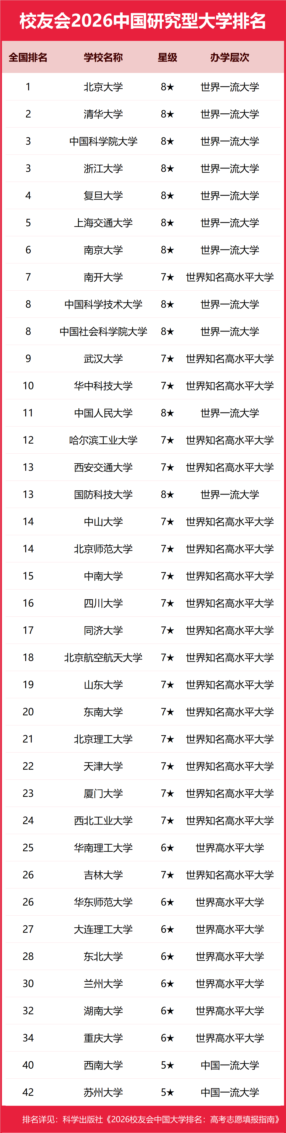 | 校友会2026中国研究型大学排名,北大清华问鼎冠亚军 | |||