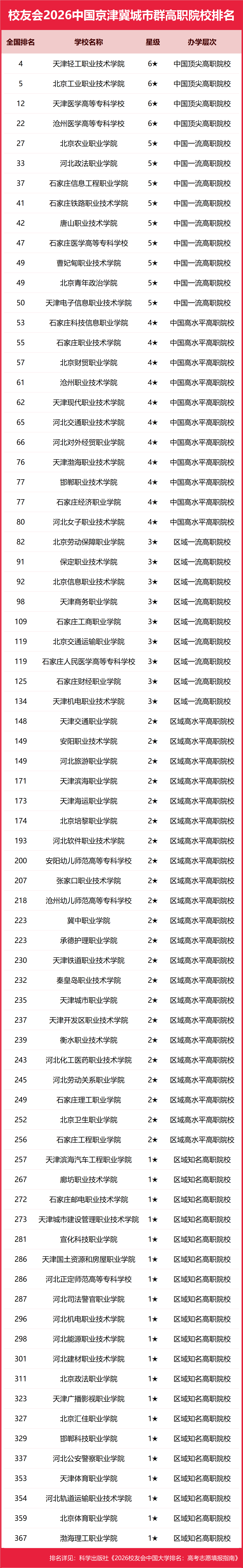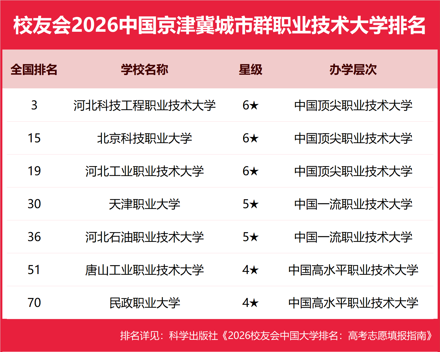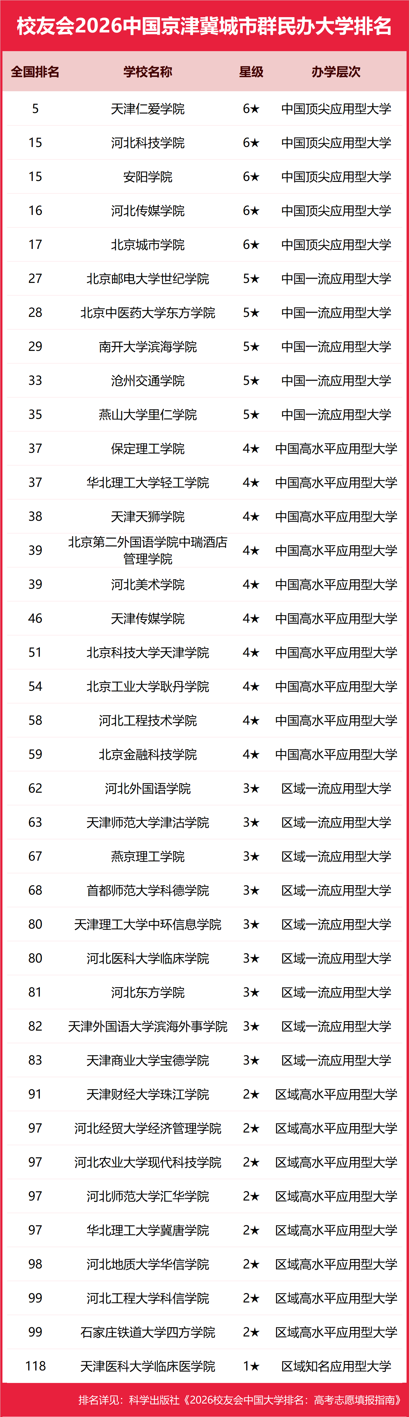 | 校友会2026中国京津冀城市群大学排名,北京大学、天津仁爱学院、河北科技工程职业技术大学、天津轻工职业技术学院第一 | |||